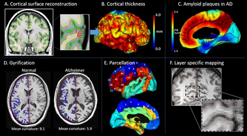 Panel A shows how the cerebral cortex can be reconstructed from MR images using 3D surface meshes that delineate its inner and outer boundaries, although image voxels are large relative to the thickness of the cortex. Panel B shows a color-coding of the cerebral cortex, indicating its local thickness. The surface meshes also permit cortical surface area to be calculated and the cortex folding to be quantified. Panel D shows how these measurements provide invaluable tools when investigating the developing and ageing brain as well as a range of diseases and neurodevelopmental disorders. Panel E shows how accurate identification of the cortical surface allows specific brain regions to be identified (parcellation) on the otherwise convoluted brain surface. This ‘map’ of the brain territories provides important reference points when reporting the results of other types of MR acquisitions (e.g. diffusion-, perfusion-, or susceptibility-weighted) or molecular images recorded by positron emission tomography (PET). Panel F shows how high resolution MR images can be used in the attempt to identify specific cell layers of the cortex (adapted from Polimeni et al.)